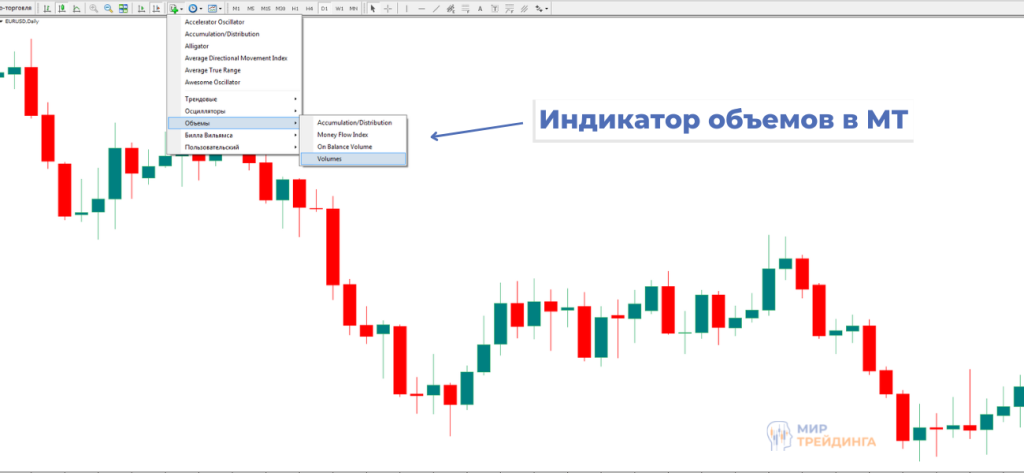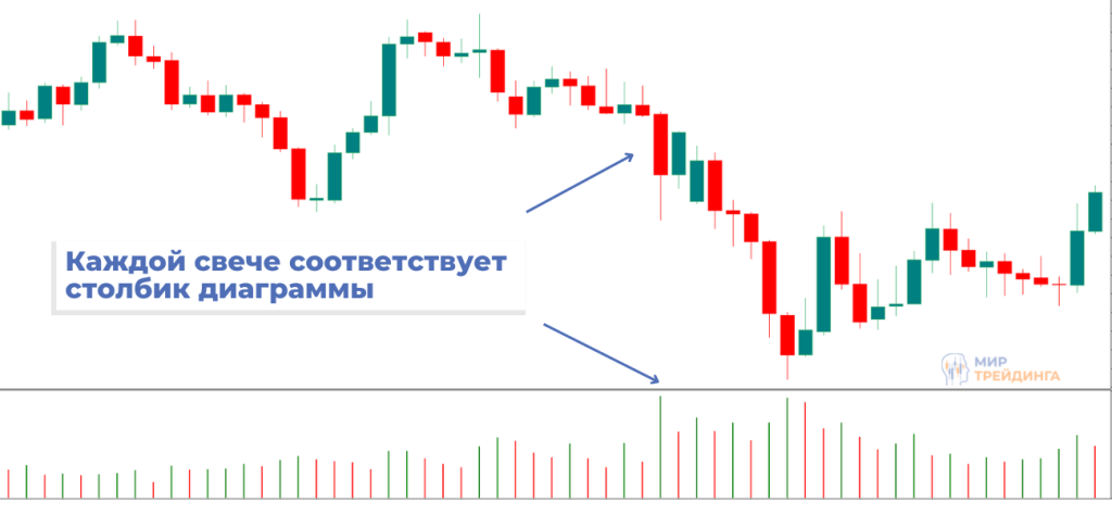 В торговых платформах, таких как MetaTrader, тиковый объем отображается с помощью стандартных индикаторов объема. Они представлены в виде гистограммы, где каждый столбец показывает количество тиков за период формирования свечи.