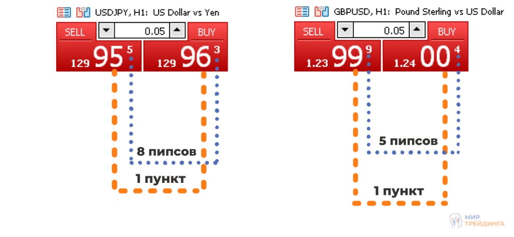 В популярном торговом терминале MetaTrader принцип аналогичен. Двумя большими значениями обозначаются числа для расчета количества пунктов. Крайнее правое число (самое маленькое) служит для расчета количества пипсов.