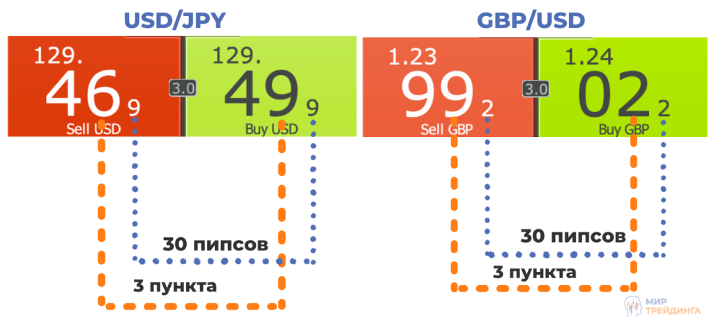В паре GBP/USD вычитаем 1,2402 — 1,2399 = 0,0003. И так как пунктом является четвертый знак после запятой, то спред составляет 3 пункта (30 пипсов).
