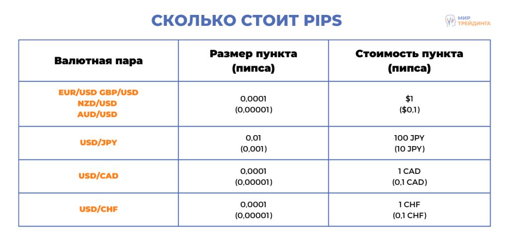 Для наглядности составим таблицу стоимости пункта и пипса (размер лота равен 0,1, то есть 10000 единиц базовой валюты).