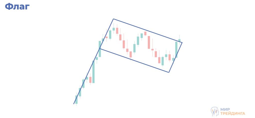 Флаг — ещё один классический паттерн продолжения тренда, в котором чётко прослеживается импульс и последующая коррекция. При восходящем тренде флаг состоит из стремительного движения вверх — флагштока — и небольшого отката вниз в виде параллельного нисходящего канала. Медвежий флаг устроен симметрично: импульс вниз и откат вверх.