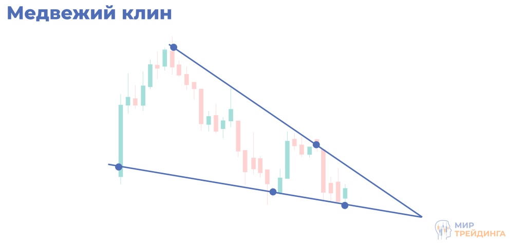Медвежий клин направлен вверх, против нисходящего тренда. Подтверждение — уход цены ниже нижней границы с закреплением под ней;