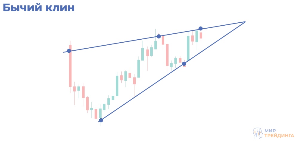 Бычий клин ориентирован против восходящего тренда — он направлен вниз. После того как цена пробивает верхнюю границу и закрепляется выше неё, паттерн считается подтверждённым;