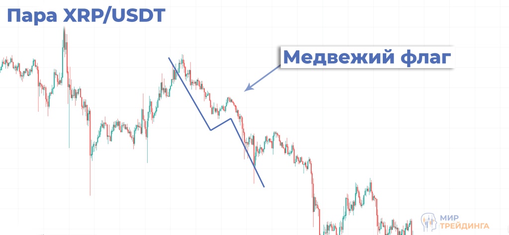 Пара XPR/USDT, таймфрейм 1H. Первоначальный импульс сформировал флагшток. После этого цена XPR перешла в коррекционный рост — флаг — с постепенным снижением объёма торгов внутри формации. Затем нижняя граница флага была пробита, и паттерн отработал в полную меру в направлении основного тренда.