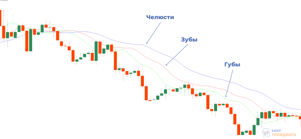 “Челюсти” – линия с самым большим периодом в 13 баров и сдвигом на 8 баров вперед;