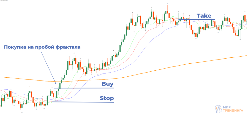 Сигналом для размещения ордера является ситуация, при которой индикатор Аллигатор показывает начало движения (линии выстраиваются в ряд), а также появление фрактала. Как уже говорилось ранее, мы смотрим на направление медленной скользящей средней и образующийся сигнал должен указывать то же направление, что и у этого мувинга. Если все условия соблюдены, мы выставляем отложенный ордер на пробой этого фрактала. Простыми словами, у нас будет подтверждение тренда и образование заходной волны. Это простая пара движений, первое из которых является началом тренда, а второе – коррекцией. После этого при пробое фрактала есть высокая вероятность развития тренда. Это движение мы и будем стараться взять по стратегии. Ордер выставляет на небольшом расстоянии от фрактала дальше по тренду. Отступ мы делаем для того, чтобы наверняка знать и быть уверенными в дальнейшем движении. Фрактал сам по себе будет небольшим сопротивлением или поддержкой, при первом приближении цена может немного отскочить. А с учетом отступа нам не придется ждать в просадке.