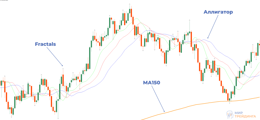 Несмотря на то, что Аллигатор применяется вместе с другими индикаторами, он сам по себе может быть готовой торговой системой. Фракталы – это просто вспомогательный инструмент, помогающий визуализировать нужный нам трендовый экстремум. А скользящая средняя с большим периодом показывает тренд, который мы можем увидеть и без индикаторов, нужен лишь небольшой опыт наблюдения за графиками. В остальном, это почти полностью готовая к работе система, которую совершенствуют и дополняют по своему усмотрению. Билл Вильямс просто постарался сделать полный комплект для трейдинга. Лишь объемный индикатор MFI действительно можно считать нужным и полезным дополнением торговой системы.