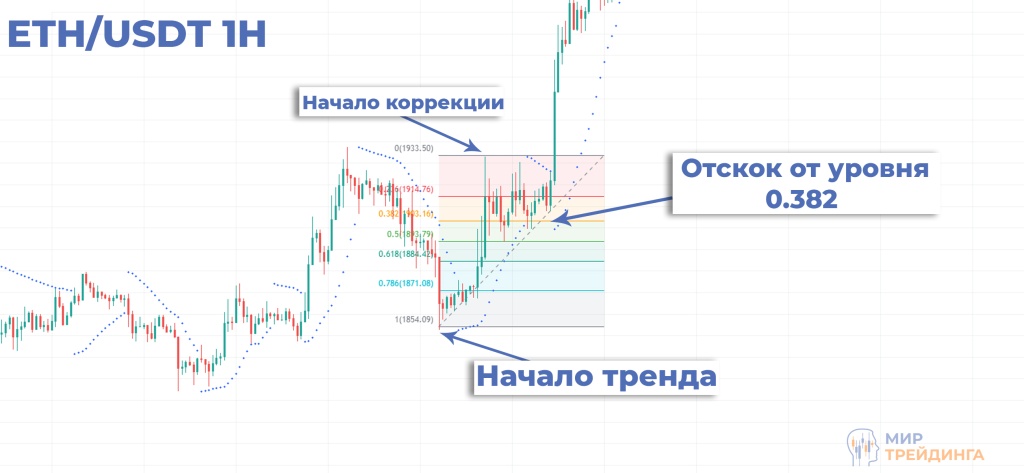 Пара ETH/USDT, часовой таймфрейм. Аналогичная ситуация прошлому примеру с биткоином. После того как цена начала коррекцию восходящего тренда, строим уровни Фибоначчи. Далее цена эфириума сделала отскок от важного уровня 0,382 и продолжила бычий тренд, а точки PSAR ушли под график.