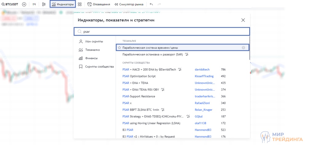 Индикатор доступен во всех современных торговых платформах. На примере TradingView его установка занимает несколько секунд: достаточно открыть вкладку индикаторов, найти SAR и добавить его на график выбранного актива.