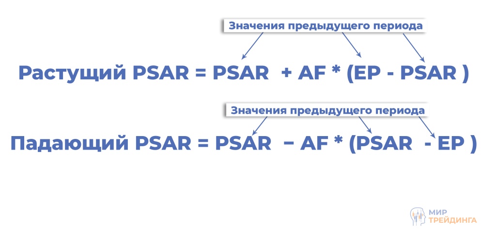В основе лежат две формулы — для восходящего и нисходящего тренда. В расчетах используются два ключевых параметра: коэффициент ускорения (AF) и экстремальная точка (EP), то есть максимум или минимум цены.