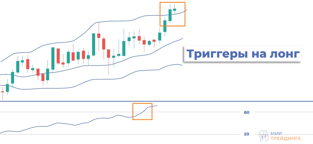 При восходящем движении трейдеры ищут сигналы для покупки, особенно при откатах к средней линии. При нисходящем — сигналы для продажи.