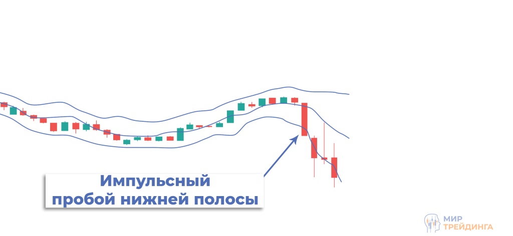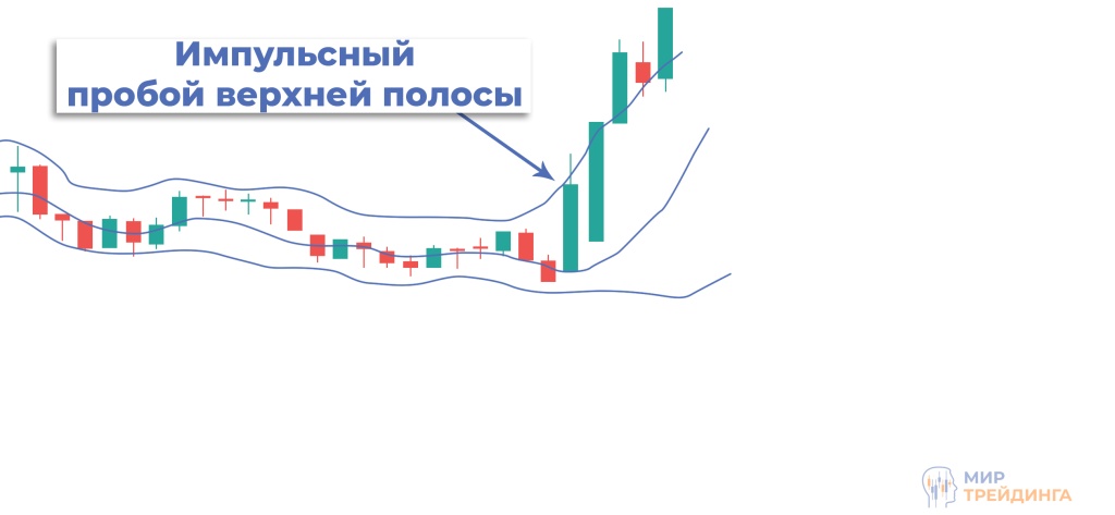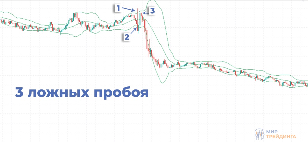 Если цена пробивает нижнюю границу и закрепляется ниже средней линии, это подтверждает нисходящее движение. Если же пробивается верхняя граница и цена удерживается выше средней линии — формируется восходящий тренд.