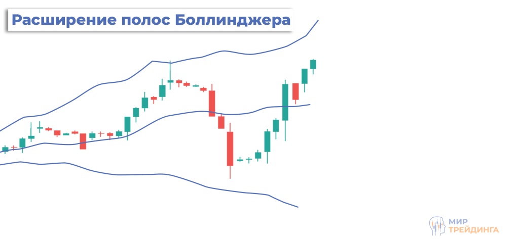 Расширение линий Боллинджера говорит об увеличении волатильности. Рынок становится активным, появляются импульсные движения.