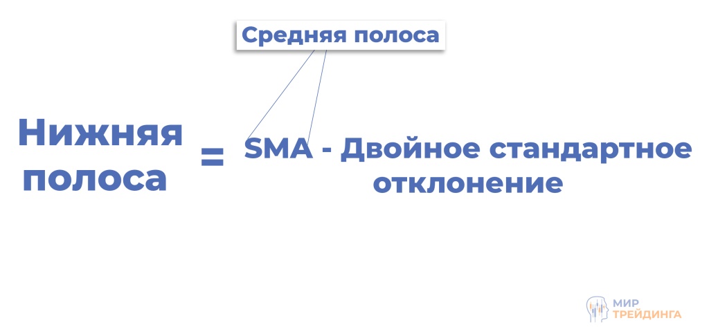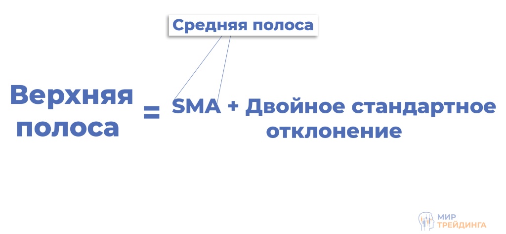 Средняя линия представляет собой простую скользящую среднюю (SMA), которая показывает среднее значение цены за выбранный период. По умолчанию используется период 20, что является стандартом для большинства стратегий.