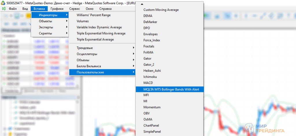 Для того чтобы отобразить индикатор на графике, в меню терминала перейдите во вкладку “Вставка/Индикаторы/Пользовательские” и выберите из списка “MT5 Bollinger Bands With Alert”.