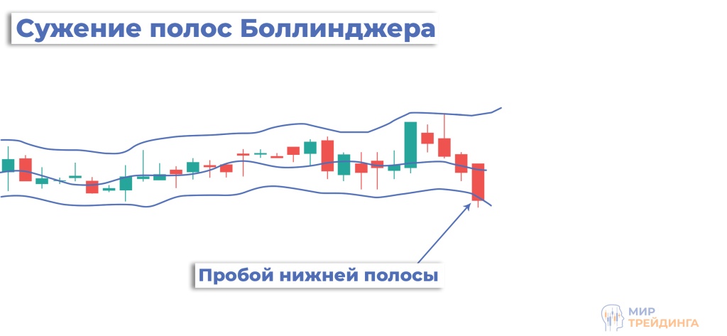 Сужение линий Боллинджера указывает на снижение волатильности и формирование бокового движения. Это состояние называется консолидацией.