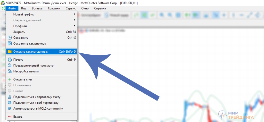 Затем, в верхнем меню терминала MT5 откройте вкладку “Файл” и “Открыть каталог данных”.
