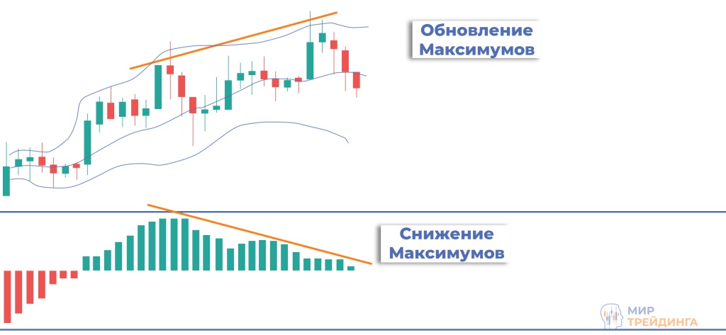 Индикатор MACD — это осциллятор, который помогает определить силу или слабость тренда путем расчета на основе скользящих средних. Визуализируется в окне под ценовым графиком в виде гистограммы. Индикатор боллинджера уже интегрирован во все популярные торговые платформы. В комбинации с полосами Боллинджера может использоваться для поиска точки разворота тренда. При смене бычьего тренда на медвежий можно наблюдать дивергенцию (Повышение максимумов цены и снижение максимумов индикатора) с пробоем верхней полосы.