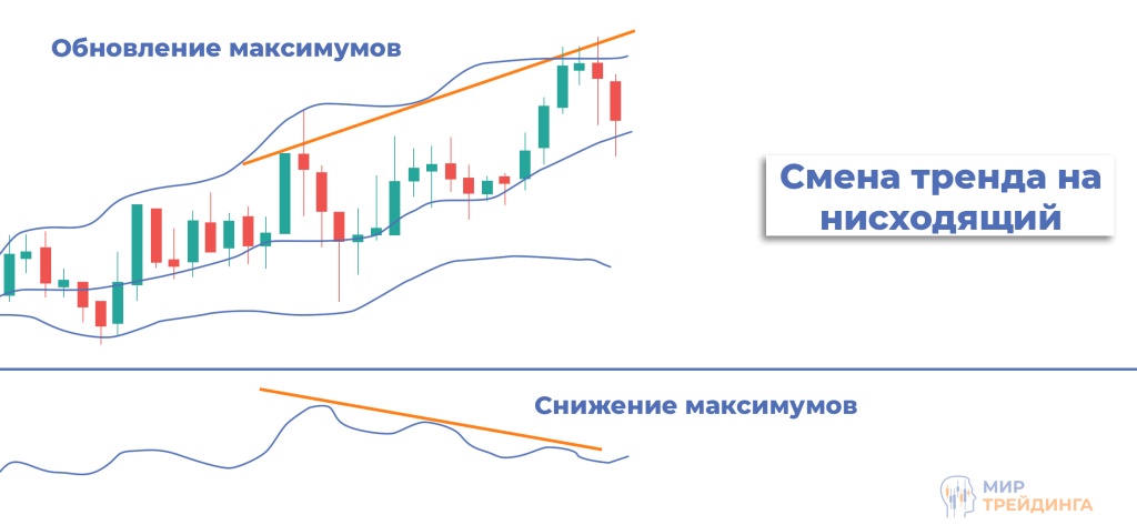 Если цена движется вдоль верхней границы — это говорит о сильном восходящем тренде. Если вдоль нижней — о нисходящем.