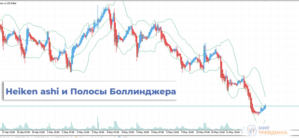 Комбинация хеки аши и полос Боллинджера даст дополнительное подтверждение тренду и точку входа в сделку. Если бычьи свечи растут и пробивают верхнюю линию, это указывает на продолжение восходящего тренда. И наоборот, наличие медвежьих свечей, которые пробивают нижнюю ленту свидетельствует о медвежьем тренде. Данный метод можно использовать на любых таймфреймах. Рекомендуемые настройки индикатора Боллинджера будут наиболее эффективны.