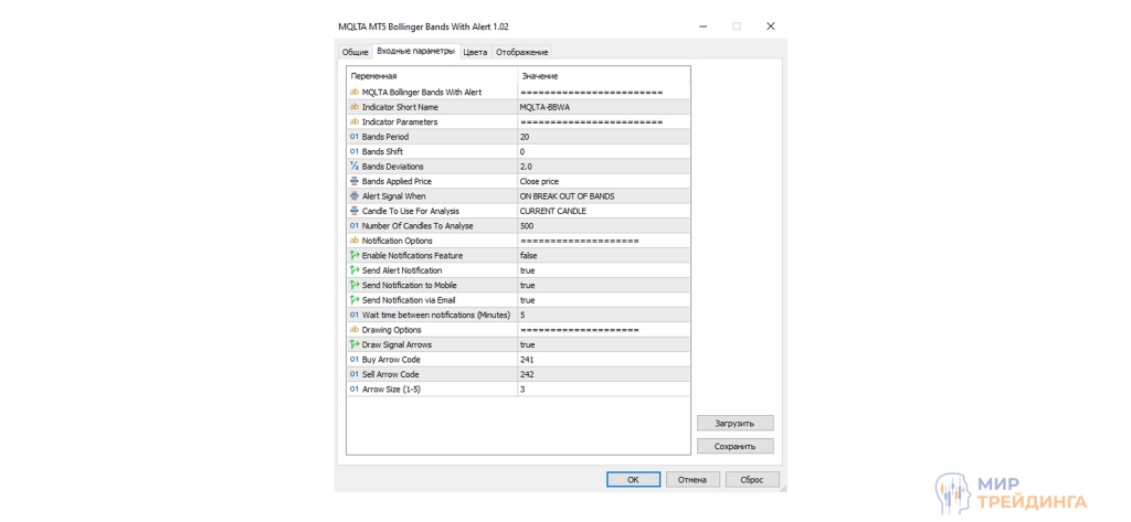 Инструмент с алертом может хорошо сэкономить время трейдера. Данный индикатор позволяет установить уведомления на пробой полос. Перейдем к установке и настройке индикатора в Metatrader: