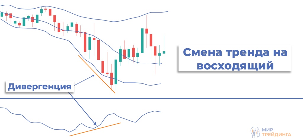 И наоборот, при смене медвежьего тренда на бычий наблюдается обновление ценовых минимумов и повышение минимумов индикатора. При этом цена пробивает нижнюю полосу.