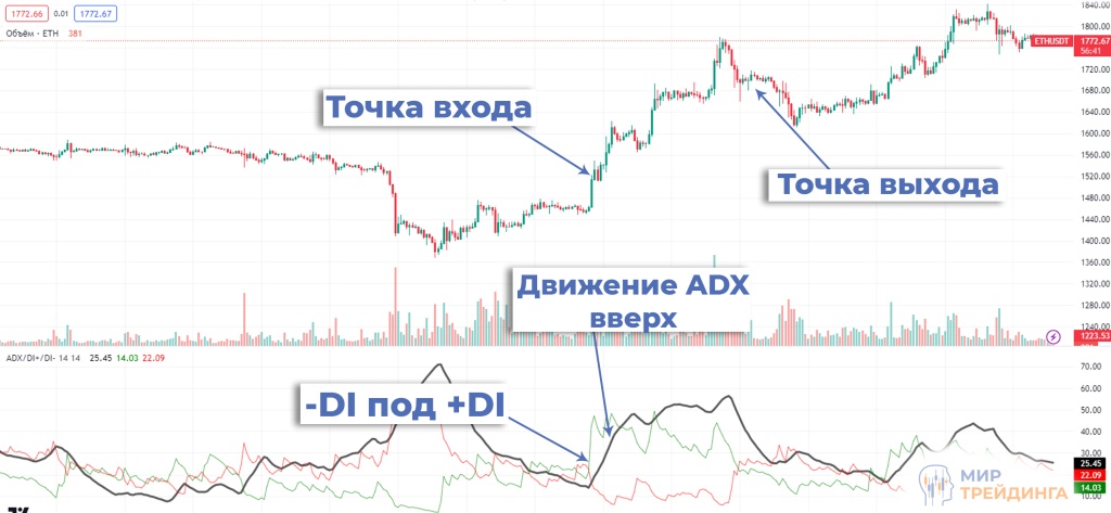 Линии +DI и -DI отдаляются друг от друга, а +DI находится выше -DI. Это сигнализирует о движении стоимости актива вверх.