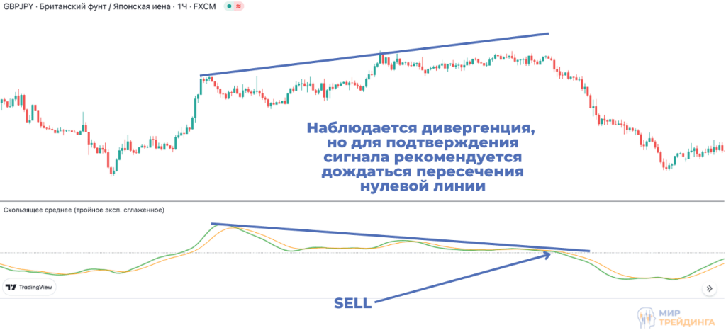 Индикатор TRIX, точно так как и прочие осцилляторы, дает сигналы при дивергенциях. Однако для дополнительной уверенности следует дождаться пересечения основной линии для подтверждения смены тренда.