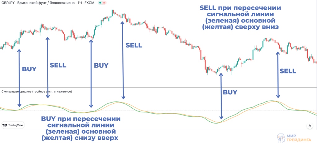 Как видно из расшифровки названия индикатора, принцип его работы основан на тройной экспоненциальной средней. Суть в том, что индикатор сглаживает результат расчета тройной экспоненциальной. В результате чего и убирается весь рыночный шум.