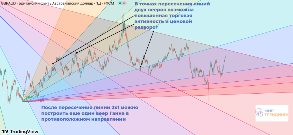 Также, в случае пересечения ценой 2x1 допускается построение дополнительного веера Ганна. Точки пересечения линий двух вееров могут быть местами разворота ценового движения. Также возле них может наблюдаться повышенная торговая активность.
