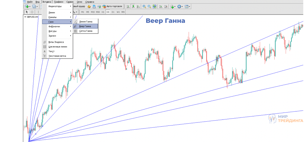 Нет необходимости в скачивании индикатора веер Ганна. Он присутствует в большинстве торговых платформ по умолчанию. Чтобы использовать его в терминале Metatrader, необходимо в верхнем меню выбрать: Вставка — Объекты (Metatrader 5) — Ганн — Веер Ганна.