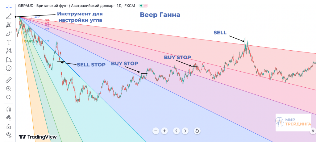 Прежде чем понять как пользоваться индикатором веер Ганна, необходимо разобраться как его нанести на график: