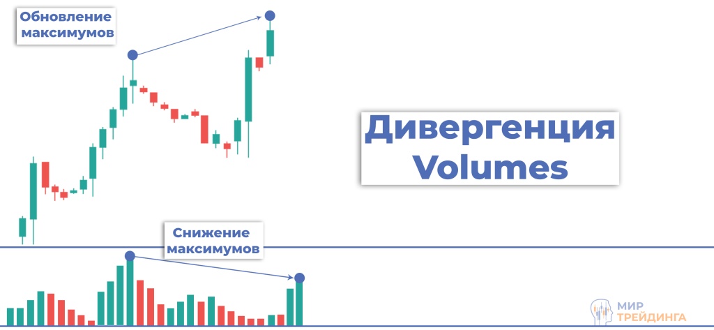 Дивергенция. С помощью дивергенции возможно обнаружить потенциальный разворот цены, завершение тренда. Сигнал будет сильнее на более старших таймфреймах от 1H. Например, вероятность завершения бычьего тренда возрастает, если на ценовом графике обновляются максимумы, а на гистограмме объемов они понижаются. Это сигнализирует о потере интереса покупателя, слабости тренда.