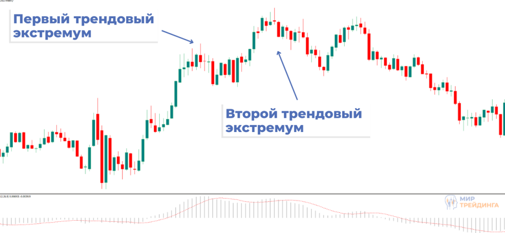 Принцип работы совпадает с описанным ранее для MACD. Диаграмма рисует максимумы и минимумы, между ними происходит откат, на графике формируется отчетливое расхождение. То есть, никаких принципиальных отличий нет. Из-за довольно большой разницы в установленных по умолчанию периодах у нас получается ситуация, когда соседние экстремумы на диаграмме могут сильно отличаться по высоте. Это свойственно как положительной области значений диаграммы, так и отрицательной. Не стоит обращать на это внимание, для трейдера важно лишь само расхождение.