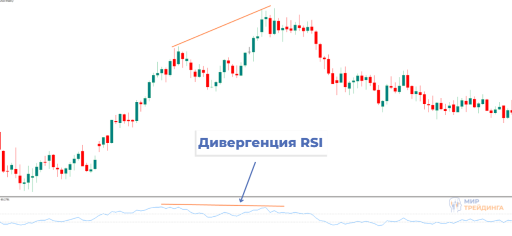 RSI формирует трендовую линию или какую-либо фигуру из технического анализа, чаще всего это Голова и плечи;