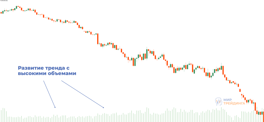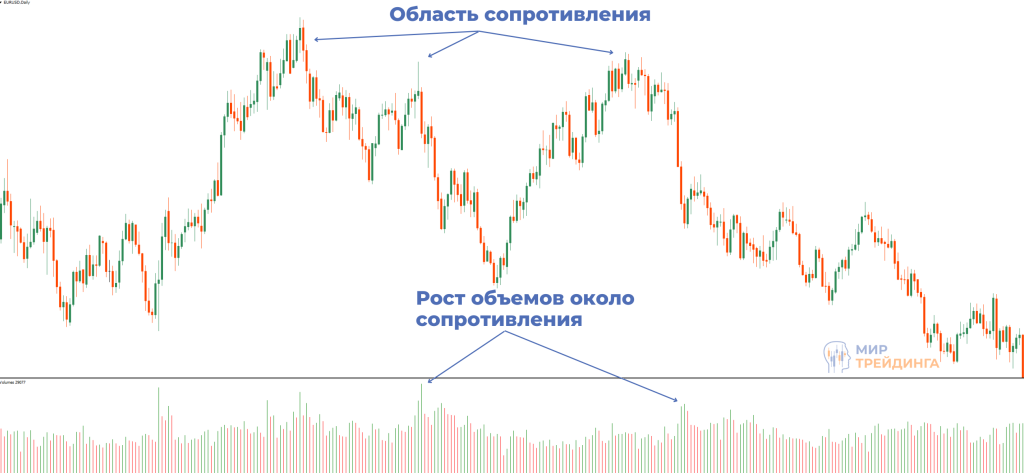 Резкий рост объема при подходе к важному уровню. Этот сигнал говорит о том, что цена не сможет легко пройти уровень и весьма вероятна коррекция. В случае с крупными таймфреймами это может быть разворот;