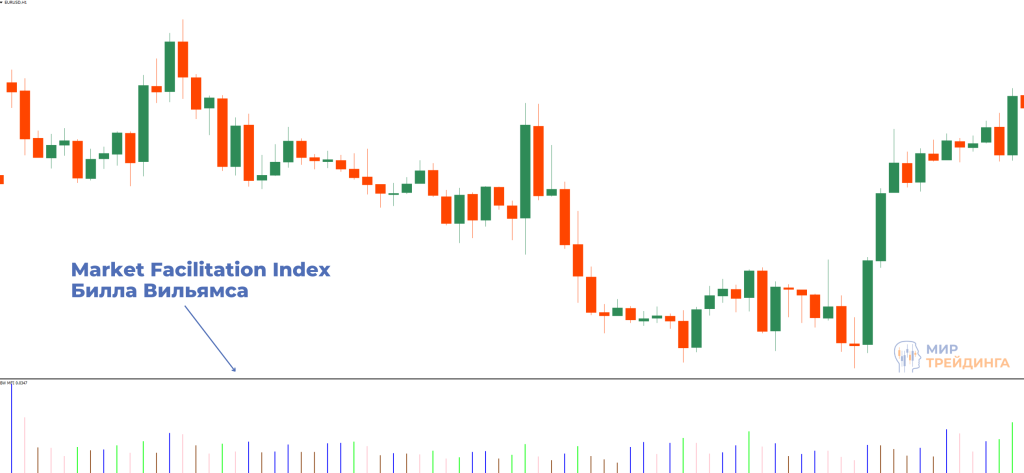Самый простой из объемных индикаторов, предлагающий оценку тиковых объемов на рынке. Алгоритм ведет подсчет количества колебаний цены и выдает результат в виде диаграммы, где под каждой свечой графика есть соответствующий ей столбик. Индикатор Volumes можно использовать как индикатор крупного объема. Он позволяет наглядно видеть резкие движения на рынке и чаще всего используется для поиска точки разворота тренда. Доступен в МТ4 по умолчанию и добавляется на график буквально в два клика. Среди модификаций часто выделяют Marker Facilitation Index, разработанный Биллом Вильямсом. Этот индикатор дополнен функционалом. Его сигналы образуются по объемным паттернам. Они представлены в виде раскрашенных в разные цвета столбиков. В целом, простой и удобный индикатор, который по всем параметрам превосходит базовый Volumes. Его также можно найти в списке стандартных инструментов анализа в торговой платформе Metatrader 4, раздел индикаторов Билла Вильямса.