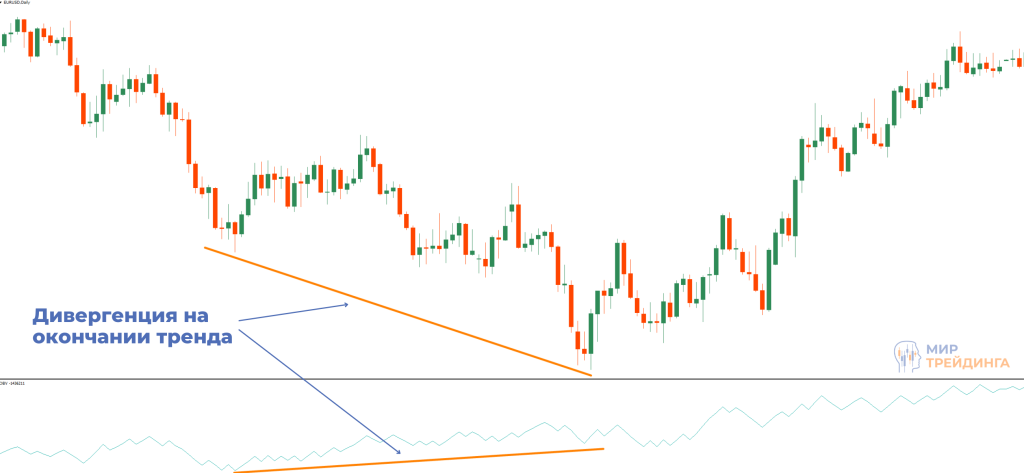 В этом случае у нас будет более репрезентативное представление рыночного состояния. Если сюда добавить анализ данных за некоторый период, то получается готовый инструмент оценки изменения рынка. Чаще всего такие объемные осцилляторы используются для поиска дивергенций. Это расхождение между тем, что происходит на графике и осцилляторе. Дивергенция показывает предстоящую смену тренда. Чем старше период графика, тем качественнее будет такой сигнал.