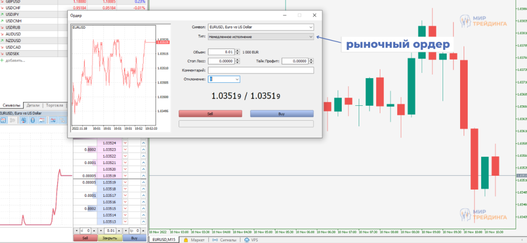Если вы хотите разместить рыночный ордер с немедленным исполнением, нужно выбрать валютную пару, тип сделки (покупка или продажа), и объём сделки (лот). В случае рыночного ордера цену указывать не нужно, сделка исполняется по текущей цене.