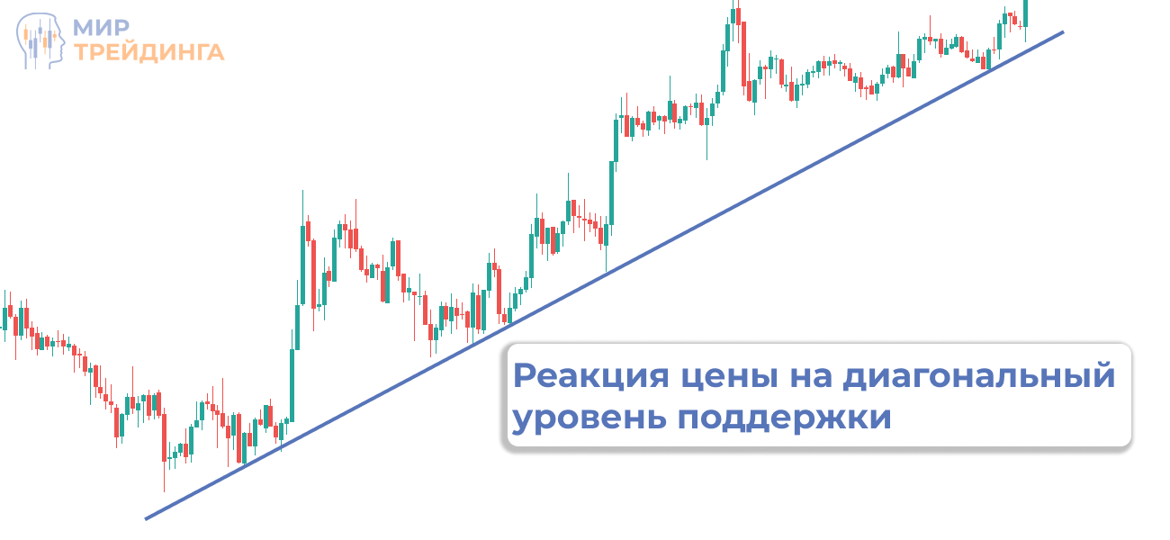Кроме горизонтальных есть и другие виды уровней поддержки и сопротивления, но принцип их построения остается таким же. Узнать о видах уровней подробнее вы можете в статье “Какие виды уровней бывают”. Пример одного из видов – диагональный уровень поддержки.