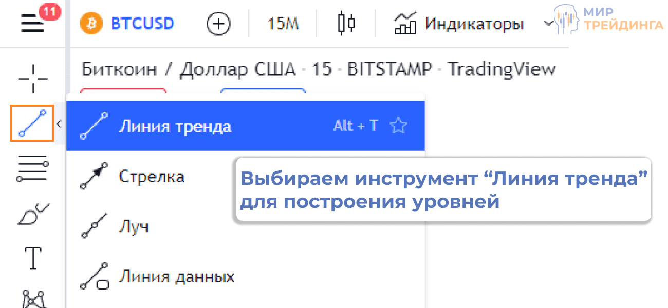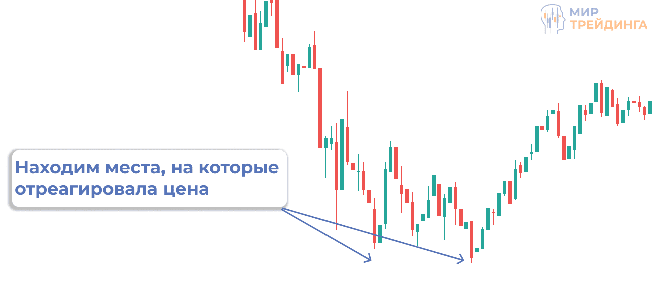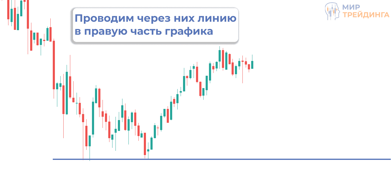- Ищем на графике точки, от которых “отскакивала” цена и с помощью инструмента “Линия тренда” проводим линию в правую часть графика