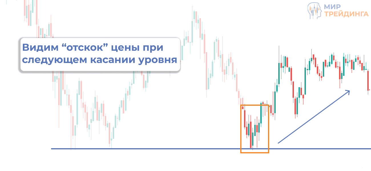 Это и будет нашим уровнем – в данном случае поддержки, так как он не дал цене пойти ниже. При следующем контакте цены с этим уровнем мы можем ожидать разворот.