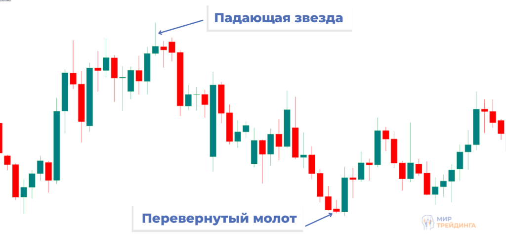 Название бычий Молот свечи нередко можно встретить на просторах интернета. Однако, официальное название модели – Падающая звезда. Она является отражением Молота по горизонтали и образуется в конце бычьего тренда. Падающая звезда дает хороший разворотный сигнал и ее часто можно встретить на макушках трендов. Отметим любопытный факт – на фондовом рынке такая модель обычно очень масштабна, так как разворот бычьего тренда часто сопровождается массовыми распродажами. Проще говоря, медвежий тренд на акциях и индексах динамичнее. Поэтому модель нередко получается большой по диапазону. И чем длиннее тень, тем сильнее сигнал. Для форекса такое нехарактерно, так как нет особой разницы в динамике между бычьим и медвежьим трендом в валютной паре.