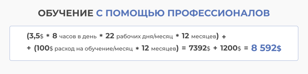 В наших примерах мы использовали рабочую специальность, которая всегда востребована и имеет легкий порог входа. Но даже при таком условии разница очевидна. При обучении со специалистом вы экономите и время (1 год) и деньги (14784$-8592$= 7392$).