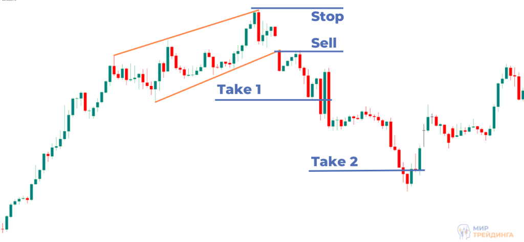 Торговый алгоритм по этому паттерну достаточно простой и предполагает несколько вариантов входа. Рассмотрим растущий клин в трейдинге и открытие сделок по нему:
