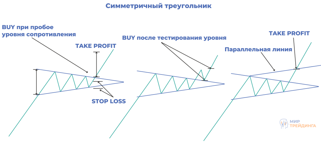 Торговля внутри симметричного треугольника, как и прочих треугольников, не рекомендуется. Так как неизвестно в какой момент цена пробьет модель. И идеально провести линии поддержки и сопротивления вряд ли удастся. Поэтому короткий stop loss скорее всего сработает и позиция окажется убыточной. Разумеется, встречаются трейдеры, которые любят заключать сделки внутри треугольника. Они открывают короткие позиции от линии сопротивления и длинные от поддержки. Но в большинстве случаев, к положительным результатам это не приводит.