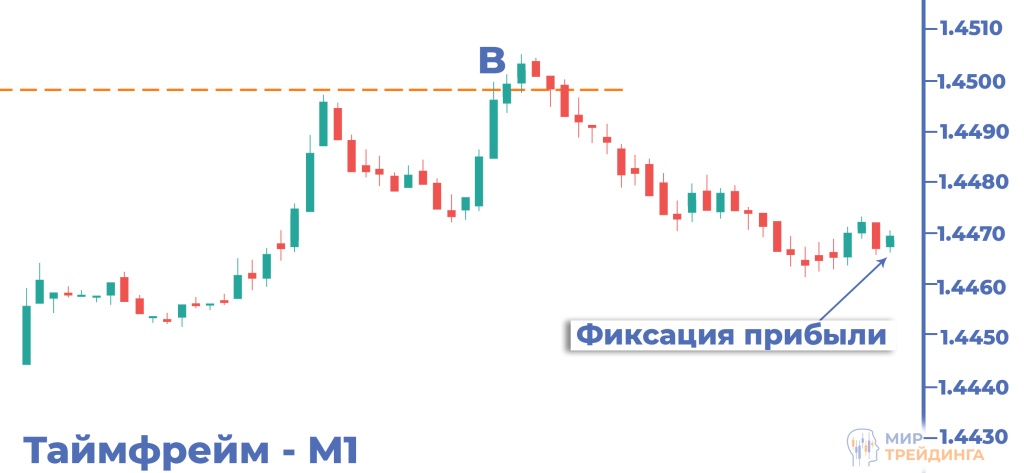 Трейдеры, которые покупали в расчете на пробой, поставили стопы под уровнем, там мы и будем продавать. Поскольку это сделка против тренда, забираем прибыль как можно быстрее, в районе 1,4470. Цена достигает этой цели за 7 минут.
