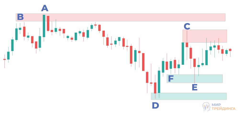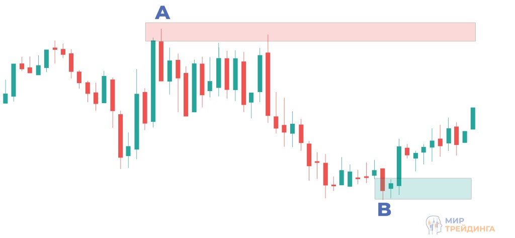 На этом 30-минутном графике зеленые линии отображают поддержку, а красные — сопротивление. В точке А поддержка стала сопротивлением, и цвет линии сменился с зеленого на красный. В точке В цена делает ретест уровня.