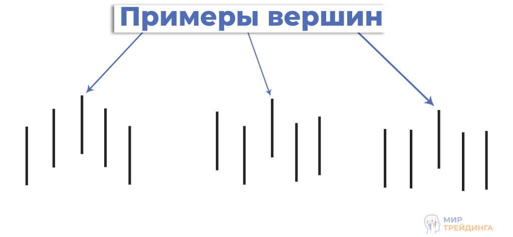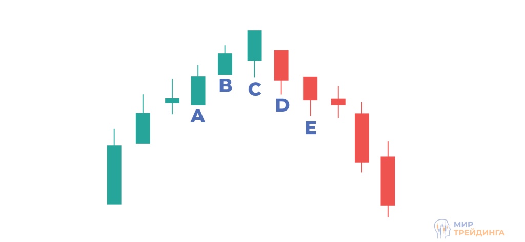 С — самая высокая веча, соседние свечи A и B справа, а также D и Е слева – находятся ниже нее. При этом необязательно, чтобы свеча А была ниже В. Такие варианты тоже возможны. Даже если вверху находятся несколько свечей на одном уровне, это все равно вершина: