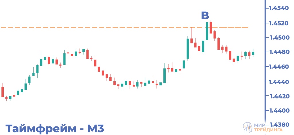 Теперь смотрим 3-минутный график, чтобы определить движение цены и сетап. Мы видим ретест в точке В, цена подходит к уровню, где может быть пробой, откат или ложный пробой. Смотрим детали на минутном графике и видим, как цена останавливается на подходе к зеркальному уровню.